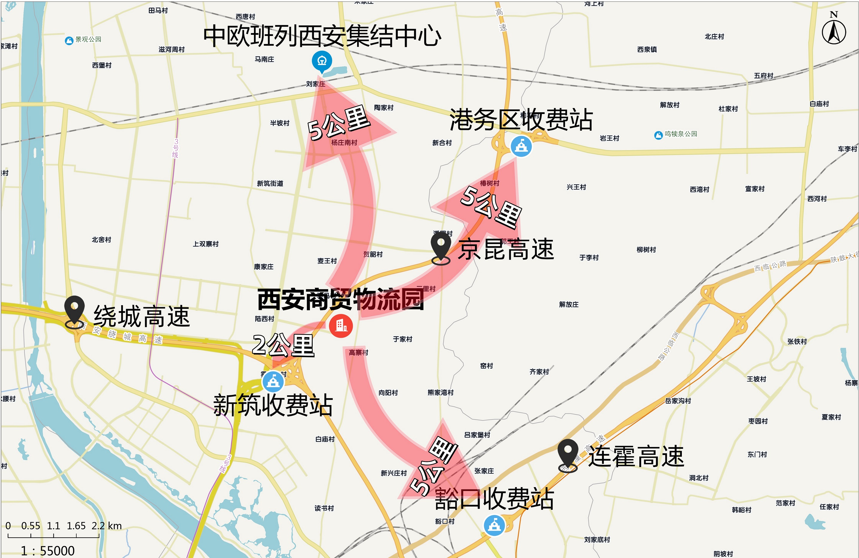 園區(qū)位于浐灞國際港元朔大道與紡渭路交叉口西北角,距繞城高速新筑收費(fèi)站約2公里,距連霍高速豁口收費(fèi)站、京昆高速港務(wù)收費(fèi)站及中歐班列西安集結(jié)中心均約5公里,出行便捷高效。